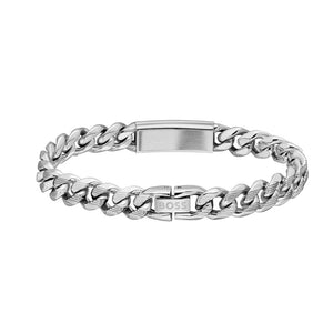 Hugo Boss Jewellery Men's Kassy Stainless Steel & Black Enamel Bracelet 1580679M. With an ink-filled logo plate and silver-tone curved chain, this BOSS Jewelry cuff elevates everyday looks. Secure clasp closure. Wrist circumference: 19cm. Width 1cm.