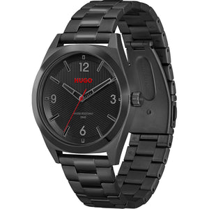 Hugo make 1530253 is a stylish mens watch with a 42 mm wide and 9.5 mm thick stainless steel case in black. This watch is fitted with a black stainless steel bracelet with a width of 22 mm at the attachment point. The black dial of the HUGO 1530253 is protected by mineral glass. The watch is water-resistant to 30m/3atm, i.e. it is splash proof. Quartz movement.