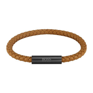 Hugo Boss leather bracelet. This bracelet made of light brown leather and black-coated stainless steel, you can bring a little casualness to your outfit. The men's bracelet is made of braided leather straps and the magnetic clasp ensures that the arm jewellery is held securely in place.