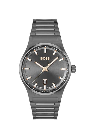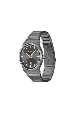Hugo boss quartz mens watch 1514078. Grey stainless steel case and bracelet with grey dial, Quartz movement. Water resistance up to 50 meters. Case size 41 mm. Mineral crystal. Push button deployment clasp.