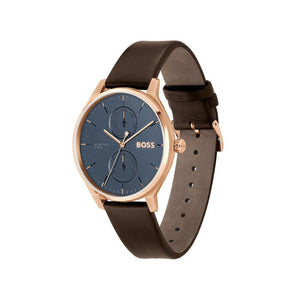This Hugo Boss watch has a case made of stainless steel with a diameter of 43 mm and is fitted with a leather band. Inside the case lies a Seiko Instruments Inc. movement and the watch features a Mineral crystal.