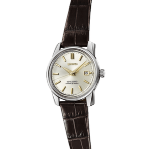 King seiko limited edition mens watch SJE087J1. Stainless steel case with a brown leather strap, silver dial. Case size 38.1mm. Automatic movement. Water resistance up to 50 meters. Box shaped sapphire crystal. Pin buckle clasp.