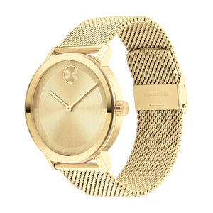 The evolution of modern design with a sharp look and elevated feel. Crafted from pale yellow goldtone ion-plated stainless steel, this sleek timepiece features a statement-making 40mm case that houses a captivating micro-textured goldtone dial with a glossy lacquer overlay, slim hands, and our iconic dot motif at 12 o’clock. The matching mesh bracelet completes the design with a minimalist edge. Quartz movement. Water resistance up to 30 meters. K1 mineral crystal. Sliding clasp.
