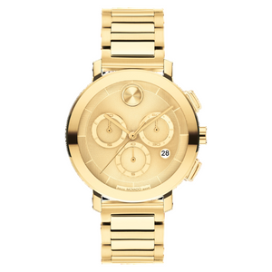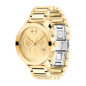 The Bold Evolution 2.0 is defined by an elevated, bold case and a dimensional micro-textured dial. This 38mm chronograph watch features a goldtone lacquer dial with tonal subdials, slim hands, and our signature dot at 12 o'clock.