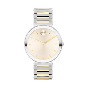 Silver tone stainless steel case with a two tone (silver tone and yellow gold tone) stainless steel bracelet. Fixed silver tone stainless steel bezel. Taupe dial with gold tone hands and index hour markers. Movado dot appears at the 12 o'clock position. Dial type analog. Quartz movement. Scratch resistant K1 crystal. Pull / push crown. Solid case back. Round case shape, case size: 34 mm. Deployment clasp. Water resistant at 30 meters / 100 feet. Functions: hour, minute. Bold horizon series. Dress watch style. Watch label swiss made. Movado Bold horizon quartz ladies watch 3601091.