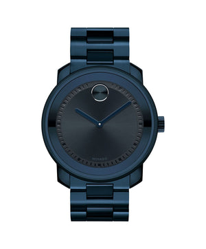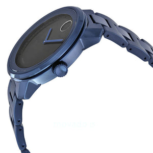 Large Movado BOLD Ink watch, 42.5 mm ink blue ion-plated stainless steel case, K1 crystal with a ring of ink blue metallization, dark navy metallic dial with matching sunray dot, ink blue hands, and stamped hour/minute index, ink blue ion-plated stainless steel link bracelet with push-button deployment clasp.