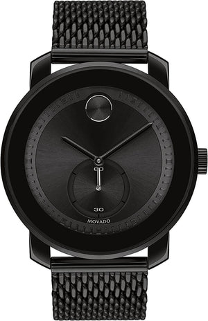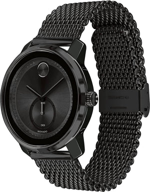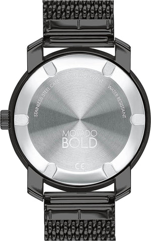 Movado Bold Evolution, 44.5 mm black stainless steel case and mesh bracelet with black chronograph dial. Scratch resistant K1 mineral. Swiss quartz chronograph movement. Case size 44.5 mm. Water resistance upto 30 meters.