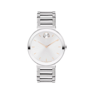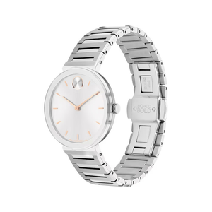 Movado Bold Horizon Watch 3601090. Refining sleek, contemporary style in an ultra-thin design. The 34mm case of this sophisticated watch is only 6.5mm thick, creating a super sleek silhouette. This timepiece is crafted from shimmering stainless steel and features a matching Y-link bracelet and tonal dial with pale rose gold-toned accents. Water resistance up to 30 meters. Push Button Deployment.