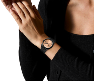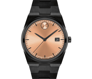 The BOLD Quest looks to the future with a shaped case and an integrated bracelet. This 40mm watch features a rose gold sunray dial, black hands, and our signature dot at 12 o'clock. Water resistance up to 50 meters. K1 mineral crystal. Deployment clasp.