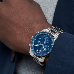 Movado bold verso chronograph 44mm stainless steel case and bracelet with tachymeter scale. Features a blue chronograph dial, Swiss Super-LumiNova accents, with date window detailing. Quartz movement. Case size 42mm. Water resistant up to 50 meters. K1 mineral crystal. Push button deployment clasp.