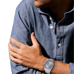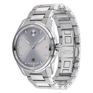 The BOLD Verso is defined by a bold, sport-inspired case and sophisticated detailing. This 42mm watch features a military grey dial, Swiss Super-LumiNova accents, and our signature dot at 12 o'clock. Stainless steel cese and bracelet with deployment clasp. Water resistance up to 50 meters. K1 minerl crystal.