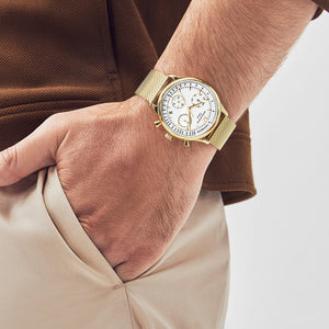 Mid century design meets sporty style. Cast in gleaming yellow gold ion plated stainless steel , this chronograph boasts a 43mm case and white dial featuring three sub dials, a date window, and a tachymeter scale. A fluid mesh strap completes this essential timepiece. Quartz movement. Case size 43mm. Water resistance up to 30 meters. Scratch resistant sapphire crystal. Sliding clasp.
