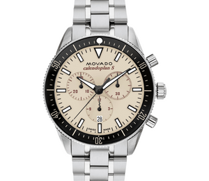 The Heritage Series Calendoplan S modernizes our classic 1950's silhouette with a sporty edge. This 42mm chronograph watch features a sand dial, Swiss Super-LumiNova accents, and a black aluminum bezel. Quartz movement. Water resistance up to 50 meters. Sapphire crystal. Deployment clasp with push button.