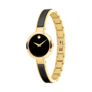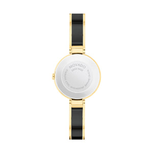 Redefining modern elegance. Iconic design meets feminine style in our new moda collection. This sophisticated bangle features a slim yellow gold PVD finished bracelet and sleek black ceramic inlay paired with a chic 24mm case framing our signature museum dial. A jewelry clasp closure completes the design. Quartz movement. Water resistance up to 30 meters. Scratch resistant sapphire crystal.
