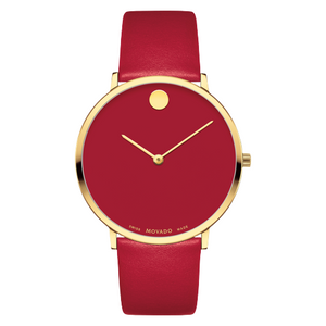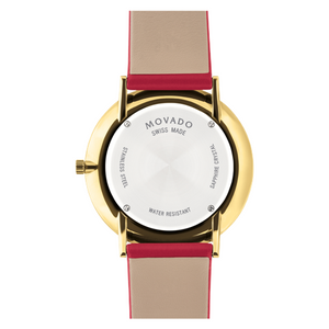 Movado Museum Dial Modern 47 watch, 40 mm yellow gold PVD-finished stainless steel case, 6.30 mm thin, with red dial and yellow gold-toned original flat dot and stick hands, red calfskin strap with yellow gold PVD-finished stainless steel classic tongue buckle. Water resistance upto 30 meters.