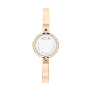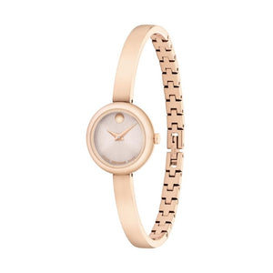 Modern, minimal, and made to stack. The Jewelry-Inspired Movado Museum Bangle. This 21.5mm watch features a round warm grey radial shimmer dial, rose gold tone dauphine hands, and our signature dot at 12 o'clock.