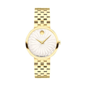 The Museum Classic is the purest interpretation of Movado's Museum Dial—an icon of modern design seen in art institutions around the world. This 29.5mm watch features a white origami-inspired textured dial, yellow gold tone dauphine hands, and our signature dot at 12 o'clock.