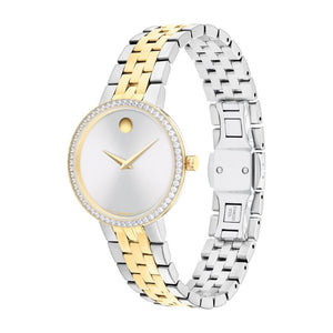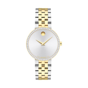 The Museum Classic is the purest interpretation of Movado's Museum Dial—an icon of modern design seen in art institutions around the world. This 29.5mm watch features a silver white sunray dial, yellow gold tone dauphine hands, lab-grown diamond pavé bezel, and our signature dot at 12 o'clock.