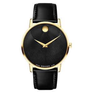 It’s time you owned a masterpiece The movado museum classic is an icon of modern design, featured in museums worldwide and renown for the elegant simplicity of the dial—defined by a single dot at 12 o’clock, a design element that symbolizes the sun at high noon. In this style, we’ve paired a 40mm case in yellow goldtone PVD stainless steel with a black burst textured dial—outfitted with our signature dot and slender hands in matching golden hues—and a luxurious black saffiano leather strap. Swiss quartz movement. Water resistance up to 30 meters. Sapphire crystal. Buckle clasp.