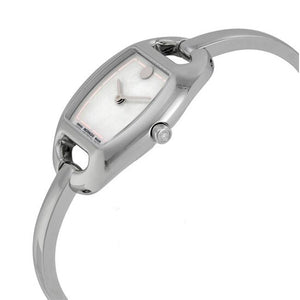 Stainless steel case with a stainless steel bangle bracelet. Mother of pearl dial with silver-tone hands. Dial Type: Analog. Quartz movement. Scratch resistant sapphire crystal. Case dimensions: 23.5 mm x 30 mm. Case thickness: 6.3 mm. Tonneau case shape. Band width: 4.5 mm. Jewelry clasp. Water resistant at 30 meters / 100 feet.