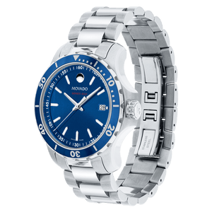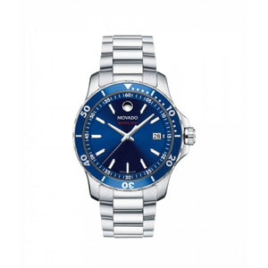 Stainless steel case with a stainless steel bracelet. Fixed stainless steel bezel with a blue aluminum top ring. Blue dial with luminous silver-tone hands and index hour markers. Minute markers around the outer rim. The Movado Dot appears at the 12 o'clock position. Dial Type: Analog. Luminescent hands and markers. Date is display at the 3 o'clock position. Quartz movement. Scratch-resistant sapphire crystal. Solid case back. Case size: 40 mm. Case thickness: 11 mm. Round case shape. Band width: 20 mm. Deployment clasp. Water resistant at 200 meters / 660 feet. Functions: date, hour, minute, second. Additional Info: in general, suitable for professional marine activity and serious surface water sports, but not diving. Sport watch style. Watch label: Swiss Made. Movado Series 800 Blue Dial Stainless Steel Men's Watch 2600137.