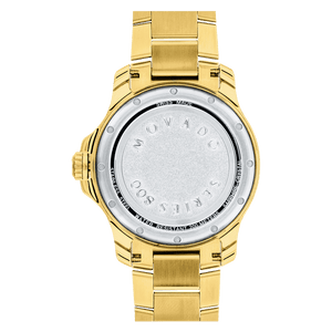 Yellow gold PVD stainless steel case and bracelet. Fixed yellow gold PVDbezel with a Black aluminium top ring. Black dial with luminous yellow gold-tone hands and index hour markers. A gold Movado dot appears at the 12 o'clock position. Minute markers around the outer rim. Dial Type: digital. Luminescent hands and markers. Date display at the 3 o'clock position. Quartz movement. Scratch resistant sapphire crystal. Screw down crown. Solid case back. Round case shape. Case size: 40 mm. Band width: 20 mm. Deployment clasp with a push button release. Water resistant at 200 meters / 660 feet. Functions: date, hour, minute, second. Sport watch style. Watch label: Swiss Made. Movado Series 800 Black Dial Yellow Gold PVD Men's Watch 2600145.