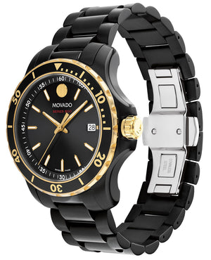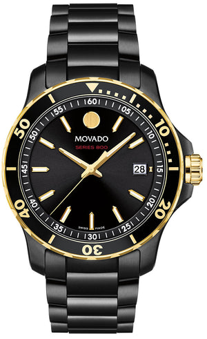 Movado Series 800. Black PVD-finished stainless steel case and bracelet with a black dial and unidirectional bezel. Case size 40mm. Water resistance up to 200 meters. Quartz movement. Sapphire crystal. Push button deployment clasp.