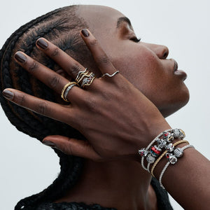 Show your strength with the Game of Thrones Spinning Astrolabe Ring. This spinning ring from the Game of Thrones x Pandora collection is plated with 14k gold and features spinning bands with intricate detailing, reminiscent of a true astrolabe. The two ring bands are connected by pins, allowing for movement. The intricate detailing adds a mythical touch together with the sparkling cubic zirconia. Inspired by the history of Westeros, it's the perfect piece for the Game of Thrones fan in your life.