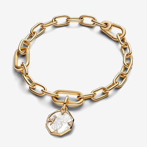 Wear a symbol of excitement with the Pandora ME Pearlescent Butterfly Medallion Charm. An octagon-shaped 14k gold-plated medallion frames a centre disc of white bioresin man-made mother of pearl featuring laser engraved butterfly silhouettes. The octagonal frame has overlapping triangular details that feature sparkling stones on one side, one of which is part of a line of stones forming a butterfly's body. Choose this butterfly charm as a reminder to embrace new experiences. Can only be styled on openable links.