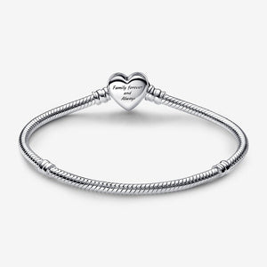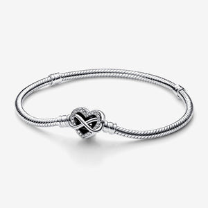 Representing the eternal love that binds family together, the Pandora Moments Sparkling Infinity Heart Clasp Snake Chain Bracelet is a meaningful gift for the ones that matter most to you. The openwork heart clasp features stones along the edge and an asymmetrical infinity symbol entwining around the heart. The back of the clasp is engraved with the message "Family forever and Always". The bracelet features two threaders (raised charm dividers) dividing it into three sections. Style it with up to 16-18 of your favourite charms or dangle charms to symbolise the ones you love, or gift it to someone close to your heart.