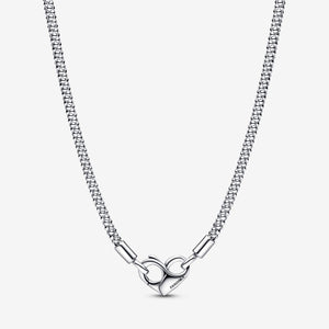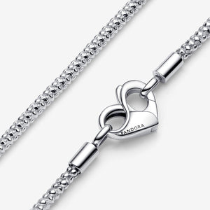 Update your collection with our Pandora Moments Studded Chain Necklace. Hand-finished in sterling silver, this necklace features a flexible, textured chain and an infinity-detailed openable heart clasp. Please note: it can be styled with any size of the Pandora Moments O Pendant or Heart Charm Pendant.