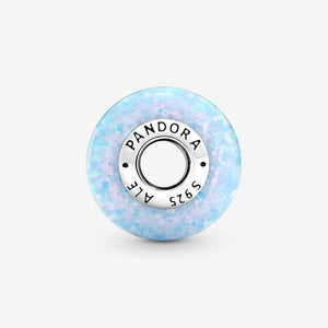 Inspired by shimmering blue ocean waves reflecting the summer sun, this beautiful lab-created opal charm is the perfect addition to your summer look. It features a sterling silver core with the Pandora logo on one side, surrounded by a lab-created opal shimmering with soft colours and glittering streaks. Each stone is unique, just like you.