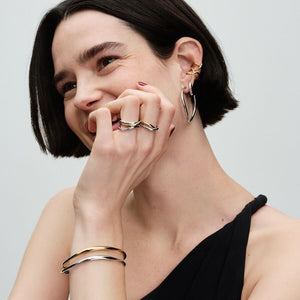 The Organically Shaped Bangle is a sleek style essential. This sterling silver bangle features a wavy profile that varies in thickness, creating a sense of movement and a subtle undulating effect. Inspired by the natural lines and curves found in nature, this modern piece is effortlessly elegant. Stack this bangle up the arm with your other favorite bracelets and bangles, or let it stand alone as a lesson in simple beauty..