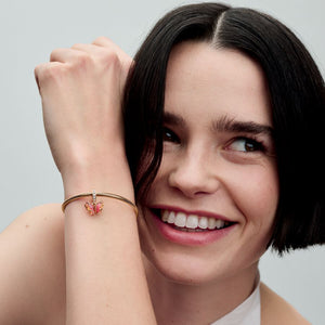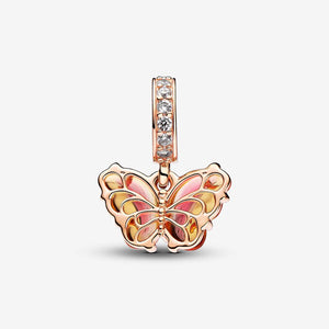 Transform into your best self with the Pink & Yellow Murano Glass Butterfly Dangle Charm. This 14k rose gold-plated charm features Murano glass wings in an orange-and-pink gradient with a cut-out pattern on the back that shows through the glass, and 14k rose gold swirls on the front. Microbeads on the butterfly's body and Pave on the bail add a touch of delicate sparkle. Add this bright butterfly to your look as a powerful symbol of transformation and new beginnings.