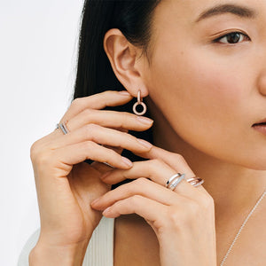 Get double the impact with the Sparkling Double Hoop Earrings. 14k rose gold-plated and hand-finished, these earrings feature two hoops with clear cubic zirconia Pave framed by micro-beading. The bottom hoop has cut-out hearts on the back side and the Pandora logo on its sides. The top hoop is attached to the bottom hoop at a perpendicular angle and the lower swings back and forth, creating eye-catching movement when you wear these statement earrings.