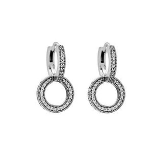 Two's better than one with the Sparkling Double Hoop Earrings. Hand-finished in sterling silver, these hoops feature two same-size linked circles with rows of bead-set clear cubic zirconia pavé. Micro-beading, embossed hearts and the Pandora logo add even more intricate details to these dangling hoop earrings, which swing from the bottom half, giving them a lovely movement. Put these on for a night out or to add a polished touch to your daytime look.