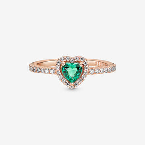 Add a sophisticated touch to your look with the sparkling elevated heart ring. The ring draws inspiration from the classic Pandora Timeless collection. Crafted from a 14k rose gold-plated unique metal blend, this piece features a green heart-shaped central, elevated stone. Clear cubic zirconia create the halo and decorate half of the ring band, while Pandora is engraved on the inside of the band. Gift this ring to someone who has captured your heart.
