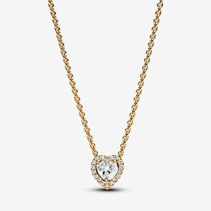Make a statement with the Sparkling Heart Collier Necklace. This 14k gold-plated necklace is inspired by classic design elements from the Pandora Timeless collection. Featuring a raised heart-shaped central stone surrounded by a halo of clear cubic zirconia, the necklace also has a rectangular tag near the clasp with an engraved Pandora logo. Adjust the necklace length to suit your style and wear with other heart-shaped pieces for a look filled with love. Length 45 cm.