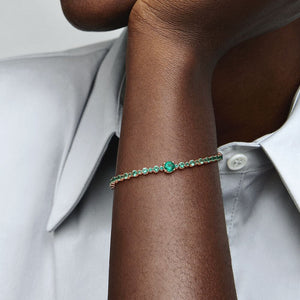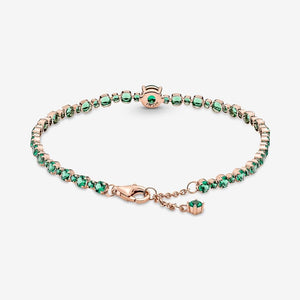 Bring elegance to your outfit with the Sparkling Pave Tennis Bracelet. Hand-finished in our 14k rose gold-plated unique metal blend, this tennis bracelet is decorated with royal green man-made crystals. A row of Pave is set with a mix of stones in alternating sizes, including a larger round center stone. The bracelet includes a lobster clasp and can be adjusted to three lengths. Style it with other shimmering Pandora pieces for a classic look.