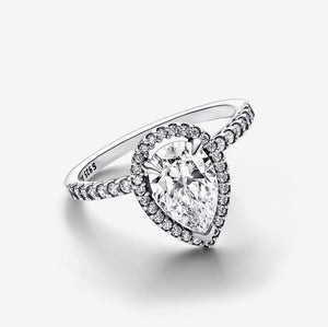 Shine brighter than ever when you wear the Sparkling Pear Halo Ring. This sterling silver ring features one striking pear-shaped stone set slightly above a delicate Pave halo. A V-shaped prong and two claw prongs hold the center stone in place. The band is smooth and polished on the bottom half and set with Pave on the upper half. A reimagined classic with ample sparkle and dimension, this ring makes a glamorous statement however it's worn.