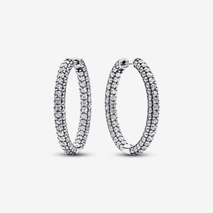 Classic hoops get a sparkling update in the Pandora Timeless pave Single-row Hoop Earrings. These sterling silver hoop earrings feature a D-shaped profile covered in pave. Set with 198 round bead-set stones, these hoops will make any look shine. Peek inside to see the iconic Pandora logo engraved on the hoops' interior. Elevate your day-to-day style with these statement hoops or pair them with other sparkling pieces for a high-impact evening look.
