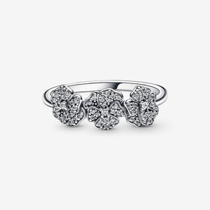 Wear a sweet reminder of the beauty of spring with our Triple Pansy Flower Ring. Three pansies bloom along a polished sterling silver band. Each flower features sparkling brilliant-cut cubic zirconia, mimicking the way sunlight dances across the petals. The newest flower to grace our garden, pansies symbolize love in its many forms. Wear this ring as a reminder of all the loved ones in your life. Create your own bouquet and stack it with other floral rings in mixed-metal finishes to turn up the flower power.