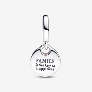 Unlock joy with the Two-tone Key To Happiness Double Dangle Charm. Crafted from sterling silver and featuring 14k rose gold plating, this two-one dangle charm features a round disc adorned with sparkling details. Engraved with "FAMILY is the key to happiness" on the polished side, it flips to reveal a textured, light-reflecting Pave side. The key, plated in 14k rose gold, swings freely, symbolizing the unbreakable bond of family. Let this heartfelt piece serve as a reminder that true happiness is found in the company of loved ones.
