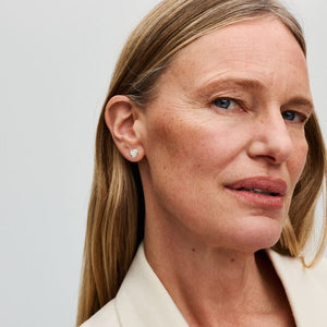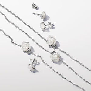 Awaken elegance with our White Rose in Bloom Stud Earrings. Crafted in sterling silver, each earring showcases a blooming white rose meticulously formed from bioresin man-made mother of pearl. The layered effect captures the essence of petals unfolding. Delicate wires embrace the rose, and heart-shaped butterfly backs add a sweet touch. Symbolizing purity and love, these earrings make a timeless gesture. Sold as a pair, they're not just accessories; they're a poetic expression of affection inspired by the artistry of nature.