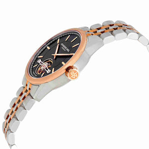 Raymond Weil Freelancer stainless steel case with a two-tone (silver and rose gold PVD) stainless steel bracelet. Fixed rose gold PVD bezel. Black dial (with an open balance wheel) with luminous rose gold-tone hands and index hour markers. Luminescent hands. Raymond Weil calibre RW1212 automatic movement with a 38-hour power reserve. Scratch resistant sapphire crystal. Screw down crown. Transparent case back. Round case shape. Case size: 42.5 mm. Case thickness: 10.6 mm. Fold over clasp with push button release Water resistant at 100 meters.