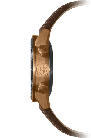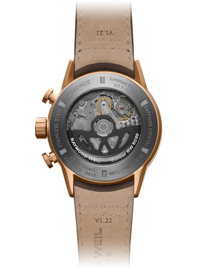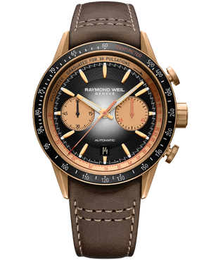 Take it on the road and make it your own. Inspired by the open road and a customised motorbike crafted by the artisans of Meister Engineering, RAYMOND WEIL unveils the new freelancer bronze chronograph 7780. This new model is an eye-catching vintage-inspired watch. And, just in case your heart is racing at the thought of it, the timepiece comes with a highly useful pulsometer scale. The two-wheeled work of art inspired our Genevan watch brand to create a bronze timepiece equipped with a chronograph, the freelancer 7780. The RAYMOND WEIL freelancer Bronze Chronograph 7780 is available in two variants, one with orange and red accents, limited to just 300 pieces, and the other with blue accents. This new chronograph is perfectly suited to free thinkers and creative individuals. This model encompasses a number of exquisite refinements. On the brand’s customised motorbike, the name RAYMOND WEIL adorns the fuel tank and is depicted in rose gold foil. This provided the inspiration for the texture of the 43.5mm bronze case and the two counters gracing the dial. Likewise, the motorbike’s gradient-effect paint influenced the watch’s black smoked dial. This latter detail confers an interesting display with light tones at the centre of the dial that assume a darker shade near the edge. The tachymeter and pulsometer scales engraved on the motorcycle tank cap are replicated on the watch’s satin-finished ceramic bezel insert and flange, respectively. Even the freelancer’s rich brown calf leather strap has been inspired by the motorbike’s leather-clad seat. Clearly, the specification of the bespoke motorbike has provided a wealth of ideas for the brand’s new vintage-inspired watch. The symmetrical bi-compax layout features a 30-minute chronograph counter and a small seconds display. The golden hour and minute hands are generously proportioned and, in conjunction with the applied indexes, prove highly legible. The hour track is snailed, while the hands and indexes feature luminescent treatment, augmenting readability in restricted light. The colour of the central chronograph seconds hand, the hand on the 30-minute register and the numerals on the pulsometer scale are all presented in the same shade. A date display is positioned at 6 o’clock, once again contributing to the overall symmetry of the dial. The date disc is presented in black, matching the colour of the dial, a detail much appreciated by purists.The tachymeter scale, presented on the bezel, provides the means to determine the speed of a motorbike, or vehicle of your choice, over a known distance. Residing on a bronze-toned flange, a pulsometer scale allows the wearer to determine the heart rate of an individual. A notable characteristic of this dial is that it wonderfully plays with shades, depths and textures, contributing to the watch’s sophisticated appearance. With time, the bronze will mature and form a patina, heightening the overall sense of elegance. To the rear of the watch, the case back is presented in stainless steel. The movement, the Calibre RW5030, is visible via the exhibition case back. Once again, the attention to detail is clear to see. For example, the watch is fitted with a W-shaped skeleton oscillating weight, a reference to the founder’s surname. A further attribute of this automatic movement is that, assuming the mainspring is fully wound, the watch will run autonomously for 56 hours. As stated earlier, the watch comes on a brown calf leather strap. It is enlivened with contrasting stitching and paired with a bronze folding clasp equipped with a double push-security system.