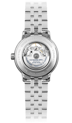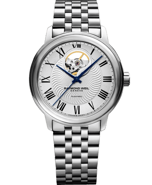The automatic movement which brings this watch to life can be observed through an opening in the silver dial at 12 o’clock. The black Roman numerals, center motif, and blue hands add to the elegance of the ensemble..The maestro watch is set on a sleek stainless steel bracelet equipped with double-push security system folding clasp.The open aperture feature enables the wearer to discover every cog in a haute-horology watch. Expertise and tradition come together to produce this maestro model – a work of formal elegance.Launched in 2010, the maestro, meaning “master”, demonstrates the mastery of RAYMOND WEIL Swiss horology and celebrates the world of classical music and the esteem commanded by a grand personality, composer or conductor. This mechanical watch collection combines elegance and sophistication with innovation, featuring some of the most renowned technical complications of the Swiss watchmaking tradition.