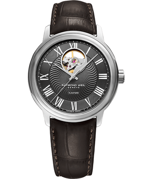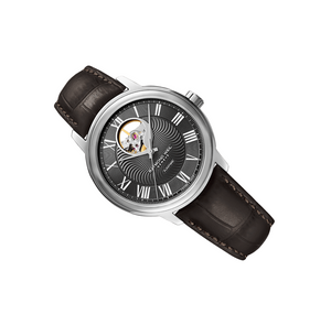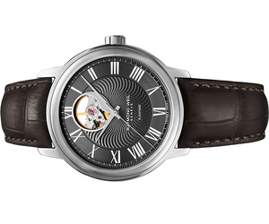 The maestro wristwatch for men features a mechanical automatic winding movement housed in a 40mm-diameter case. The stainless steel case is equipped with an aperture at noon, subtly revealing the heart of the watch and showing a captivating grey dial, endowed with a delicate wave-like decoration.