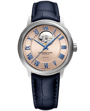 The maestro for men features a mechanical automatic winding movement housed in a 40mm-diameter case. The stainless steel case is equipped with an aperture at noon, subtly revealing the heart of the watch and showing a captivating pink dial.The maestro, meaning “master”, demonstrates the mastery of RAYMOND WEIL Swiss horology and celebrates the world of classical music and the esteem commanded by a grand personality, composer or conductor. This mechanical watch collection combines elegance and sophistication with innovation, featuring some of the most renowned technical complications of the Swiss watchmaking tradition.