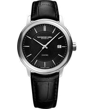 Raymond Weil stainless steel case with a black calfskin croco-embossed leather strap. Fixed stainless steel bezel. Black dial with silver-tone hands and index hour markers. Minute markers around the outer rim. Automatic movement with a 38-hour power reserve. Scratch resistant sapphire crystal. Transparent case back. Case size: 39.0 mm. Deployment clasp with a push button release. Water resistant at 50 meters.